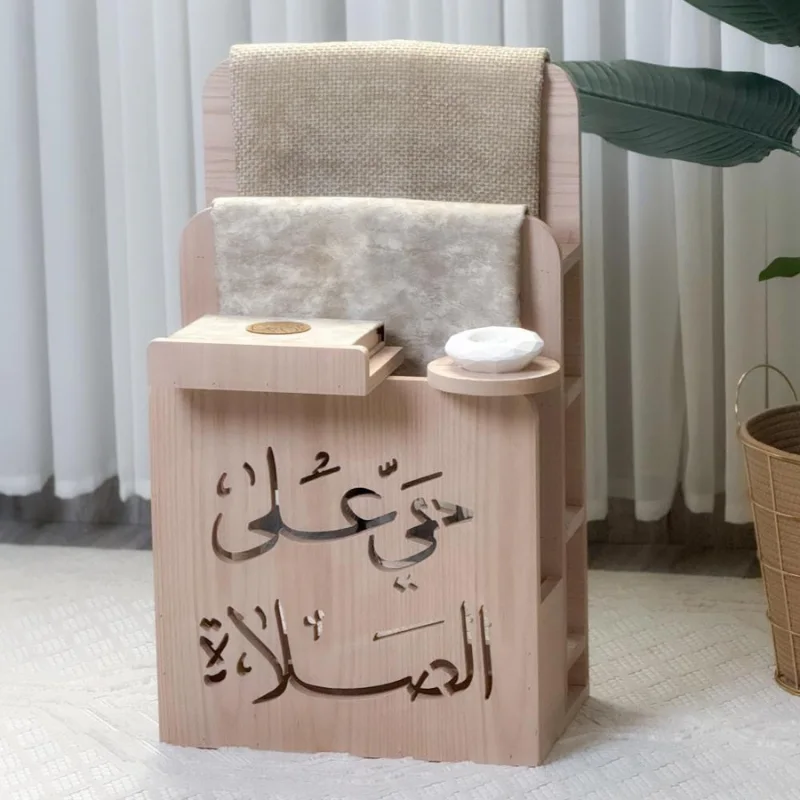 نقدم لك "منظم سجادة العصري" المصنوع بدقة وعناية. قطعة فنية تجمع بين الأصالة والوظيفة، مصممة خصيصاً لتنظيم ركنك الروحاني في مكان واحد وبأناقة لا مثيل لها.